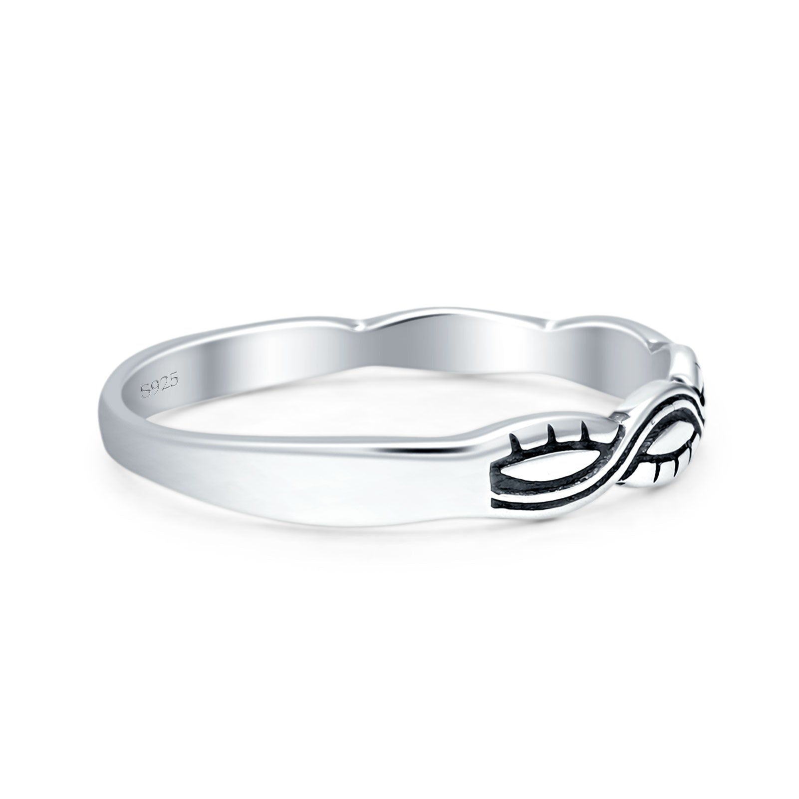 A dainty 3.5 mm evil eye wave band ring crafted in 925 sterling silver with an oxidized vintage finish a minimalist, stackable piece that adds subtle charm to everyday wear. Designed with symbolic protection in mind, it’s a meaningful gift for her that blends style with timeless spiritual flair. Perfect for layering or wearing solo to express personal style and positive energy.