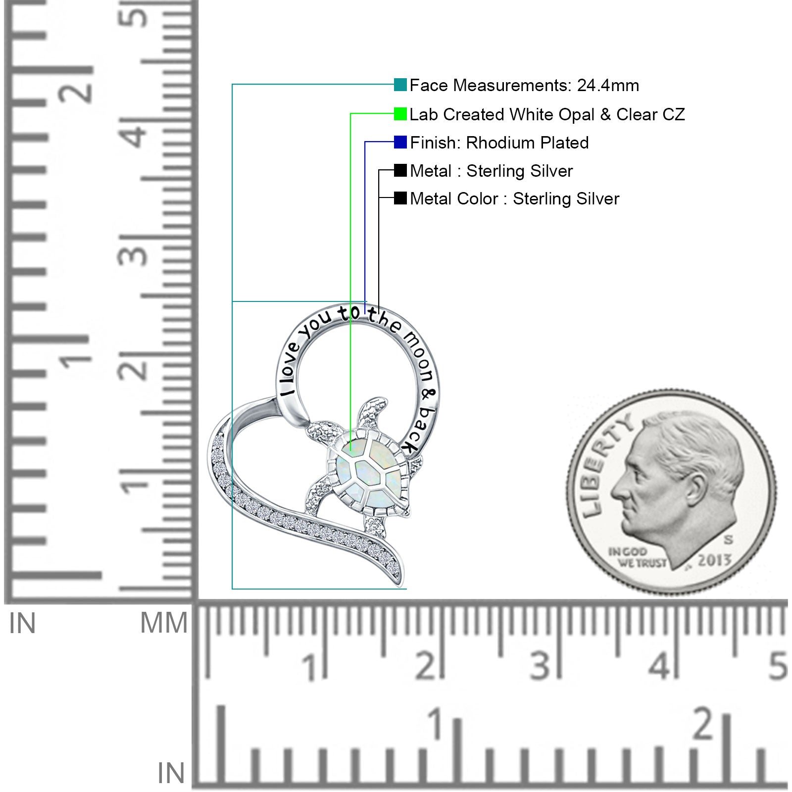 Lab Created White Opal & CZ Turtle & Heart Pendant 925 Sterling Silver