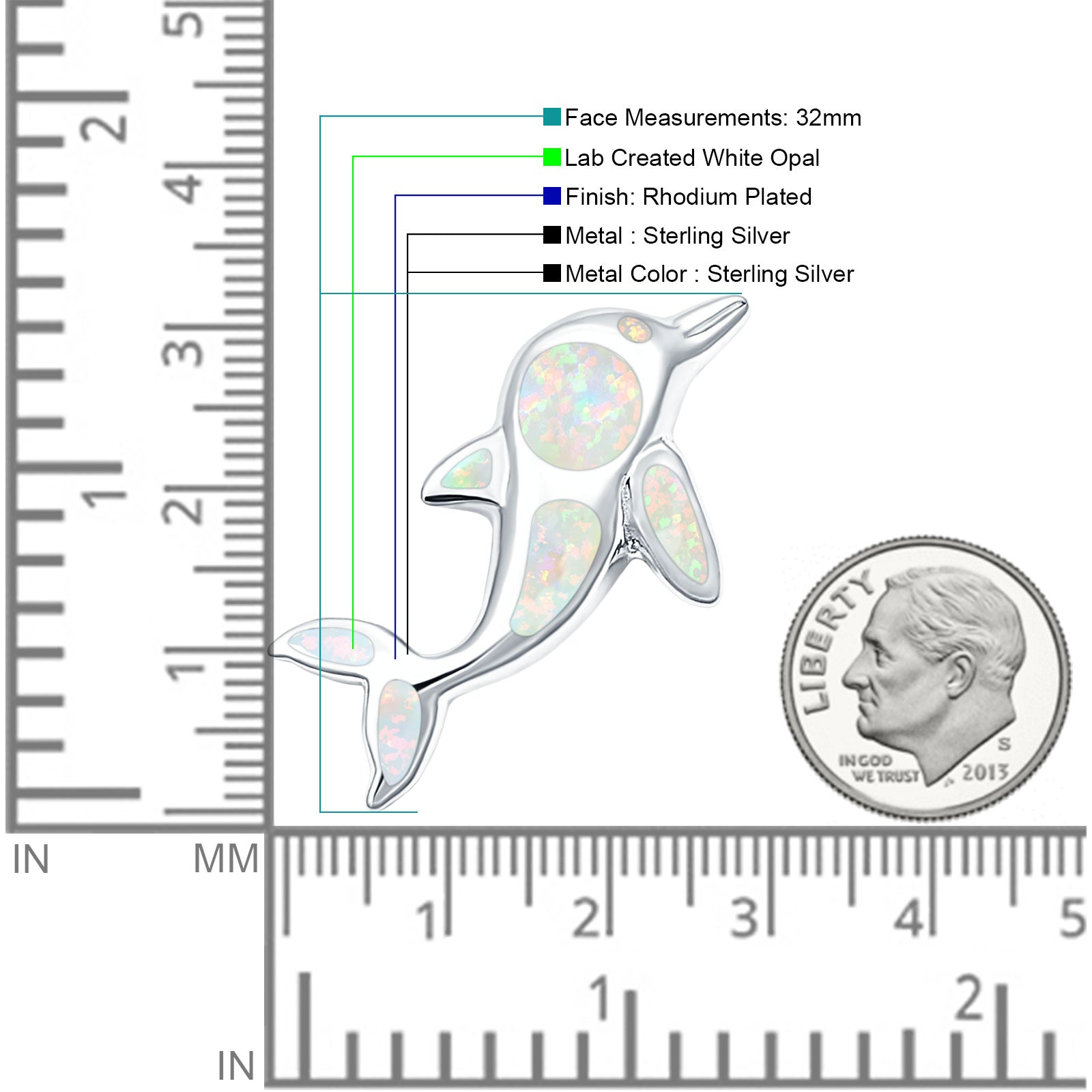 Lab Created White Opal Dolphin Pendant 925 Sterling Silver
