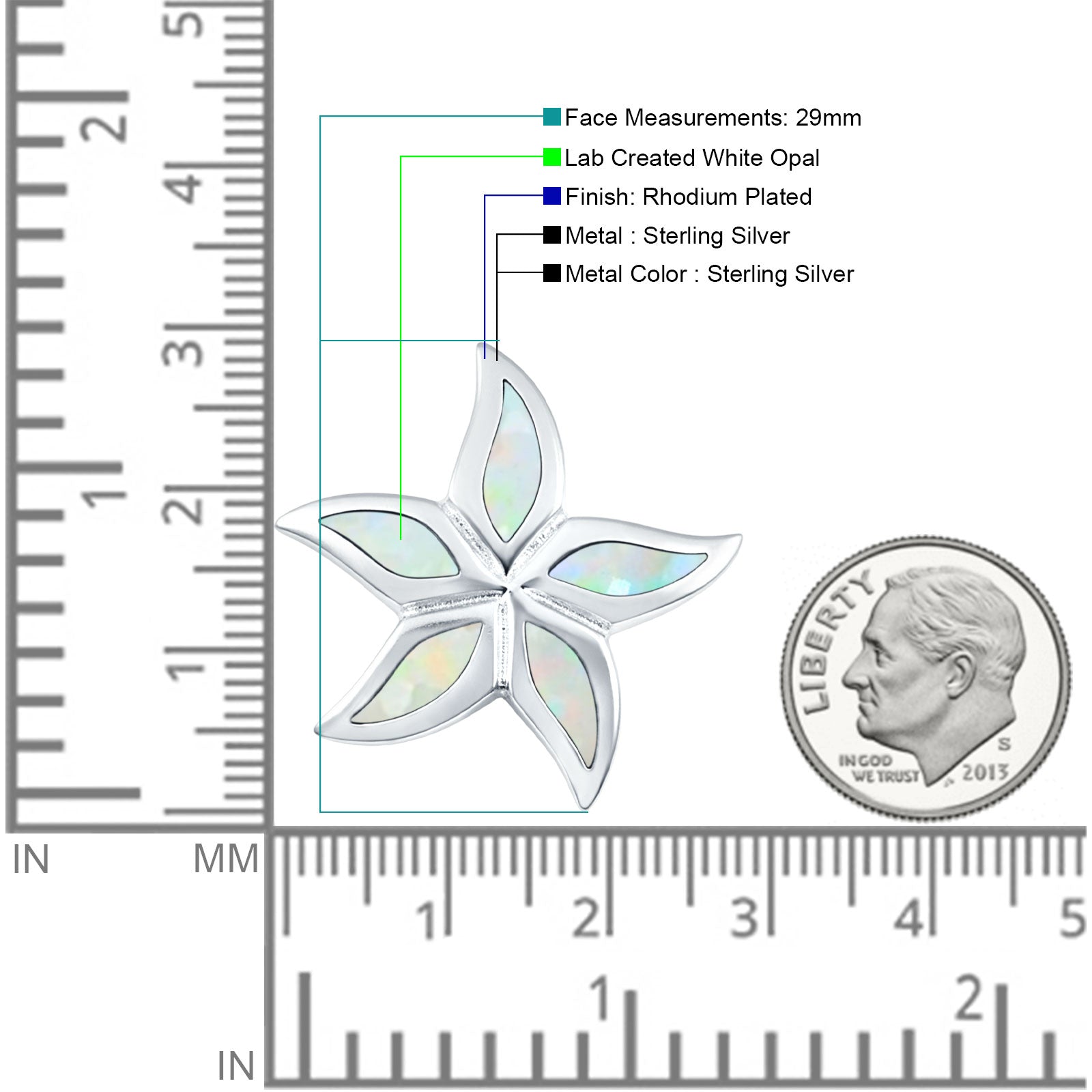 This lab-created White Opal starfish pendant necklace captures ocean-inspired beauty with its vibrant 29mm starfish design crafted in 925 sterling silver and finished with rhodium plating.