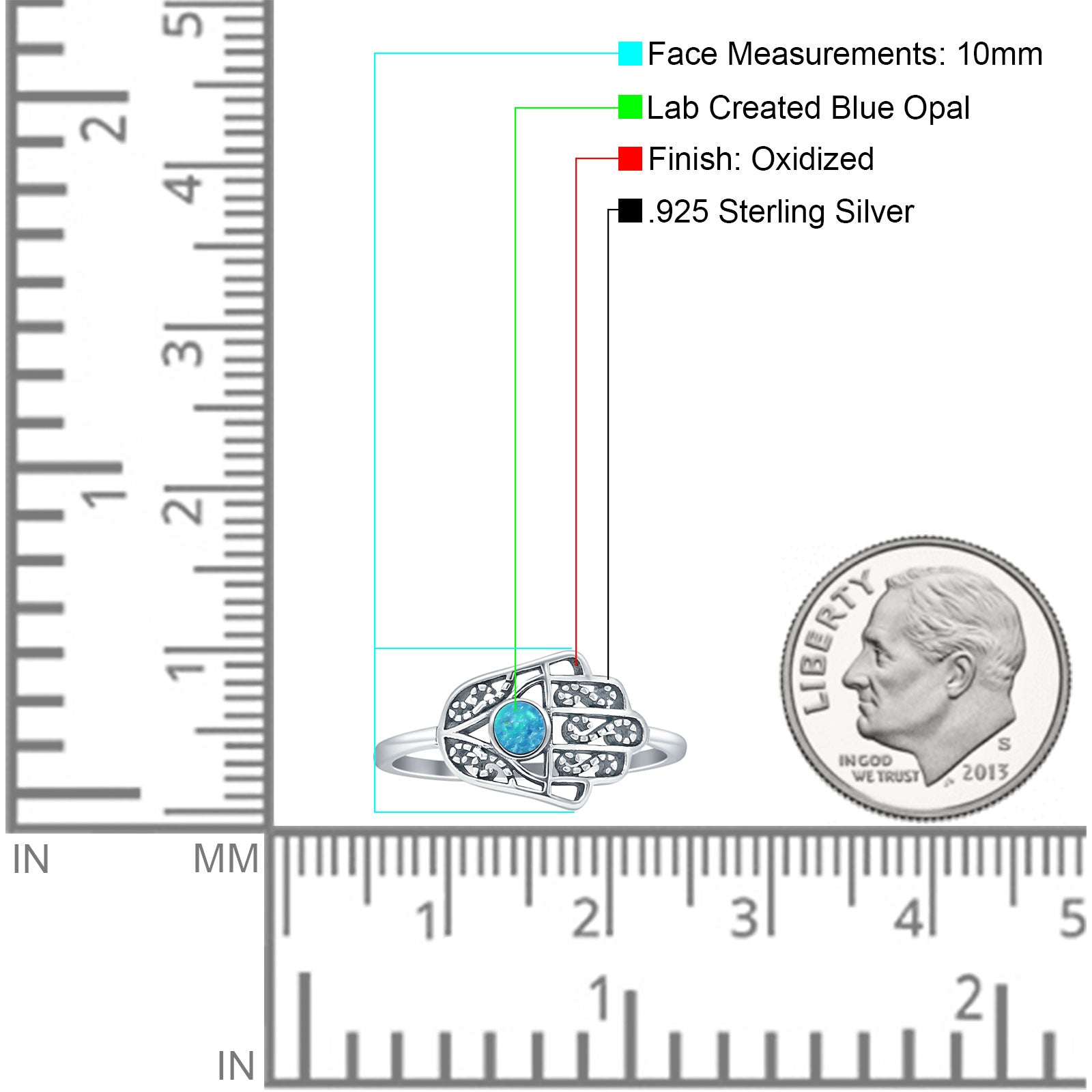 Round Lab Created Blue Opal Hamsa Hand Ring Oxidized 925 Sterling Silver