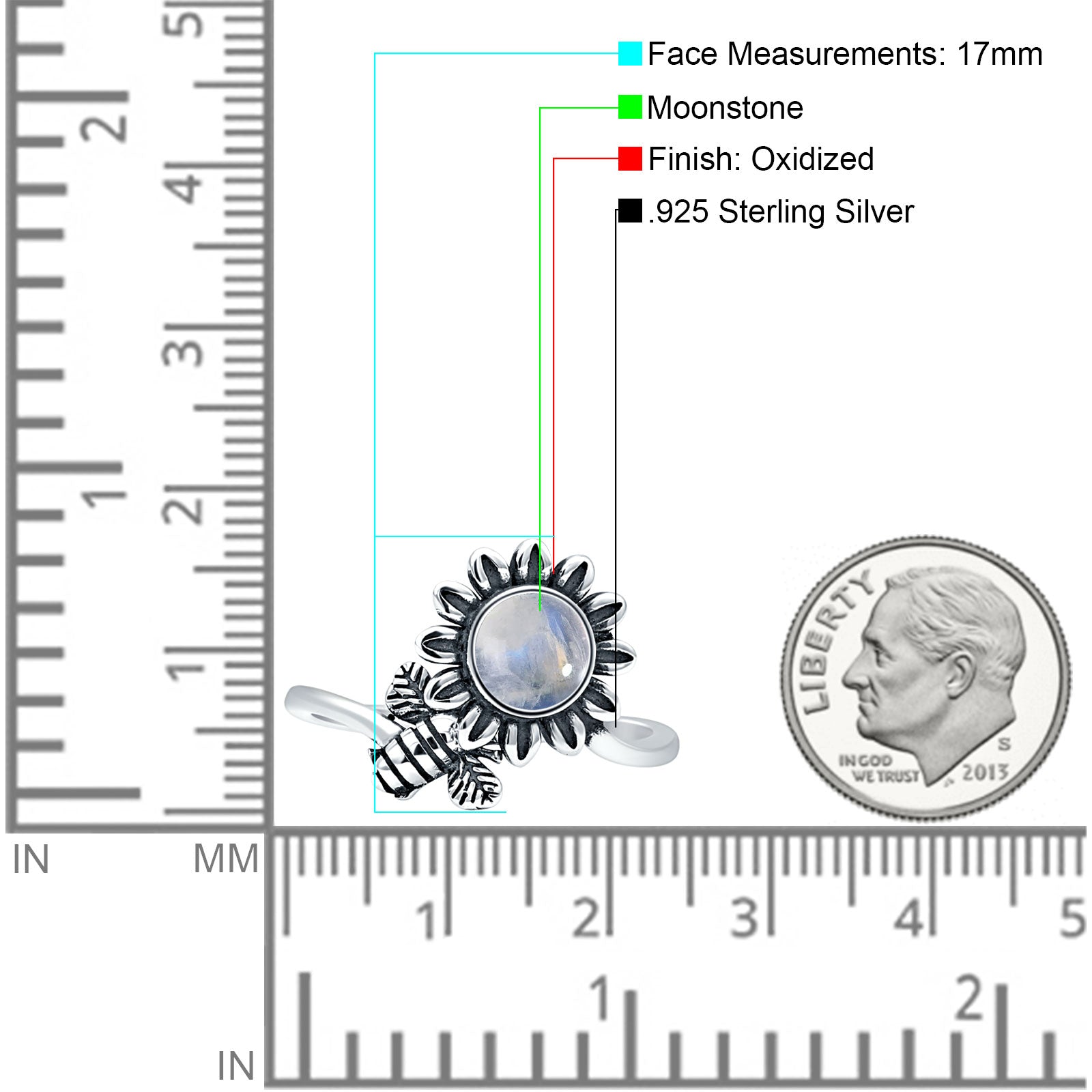 Round Moonstone Flower & Bee Ring Oxidized 925 Sterling Silver Wholesale