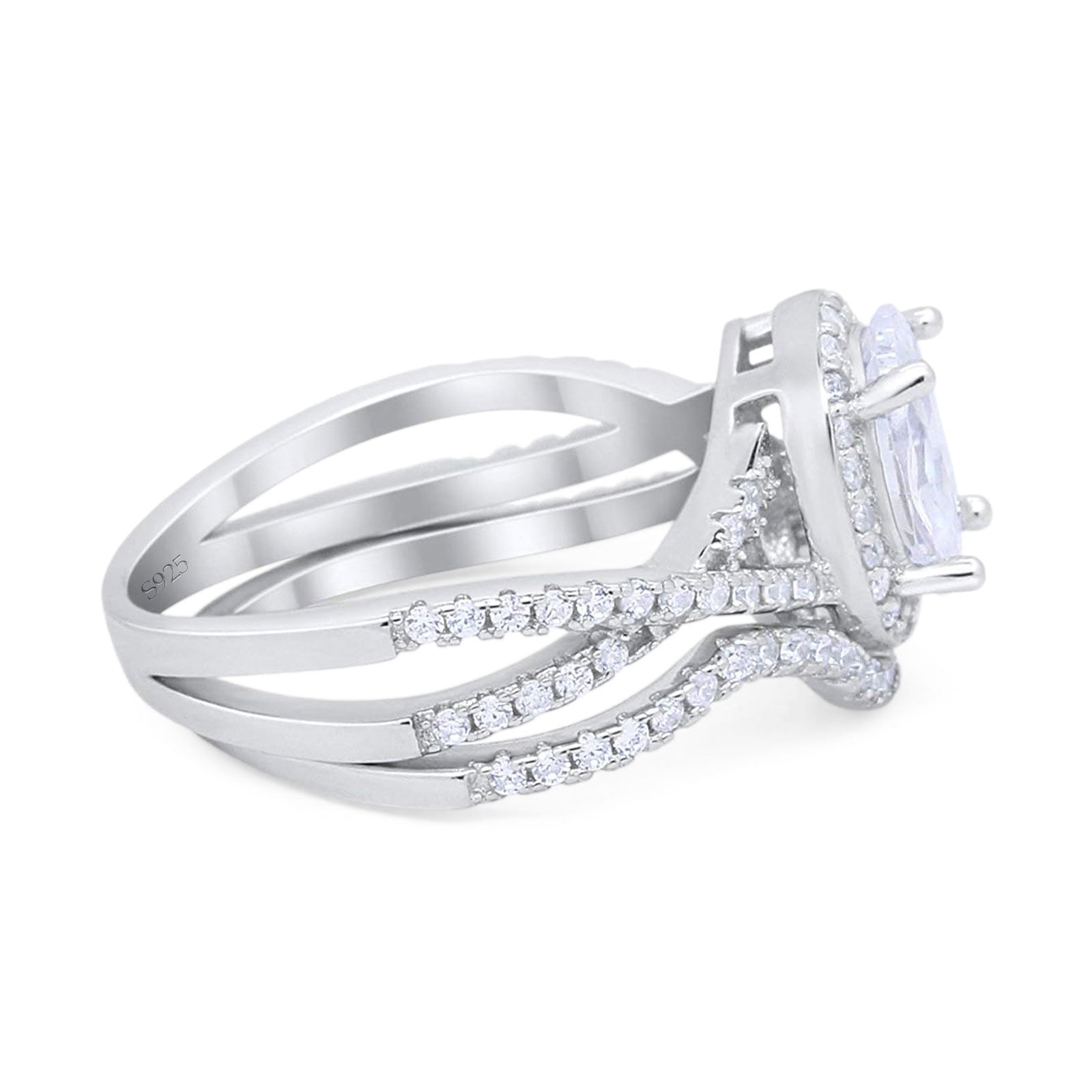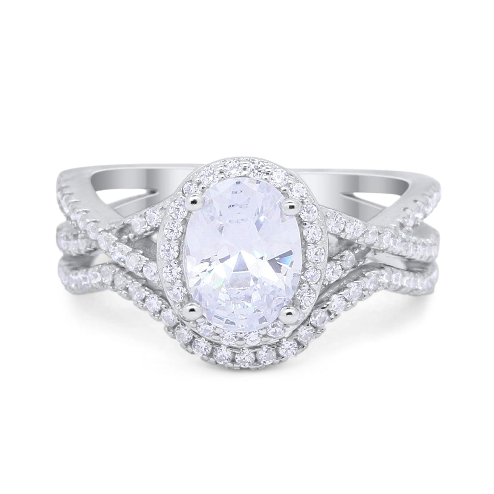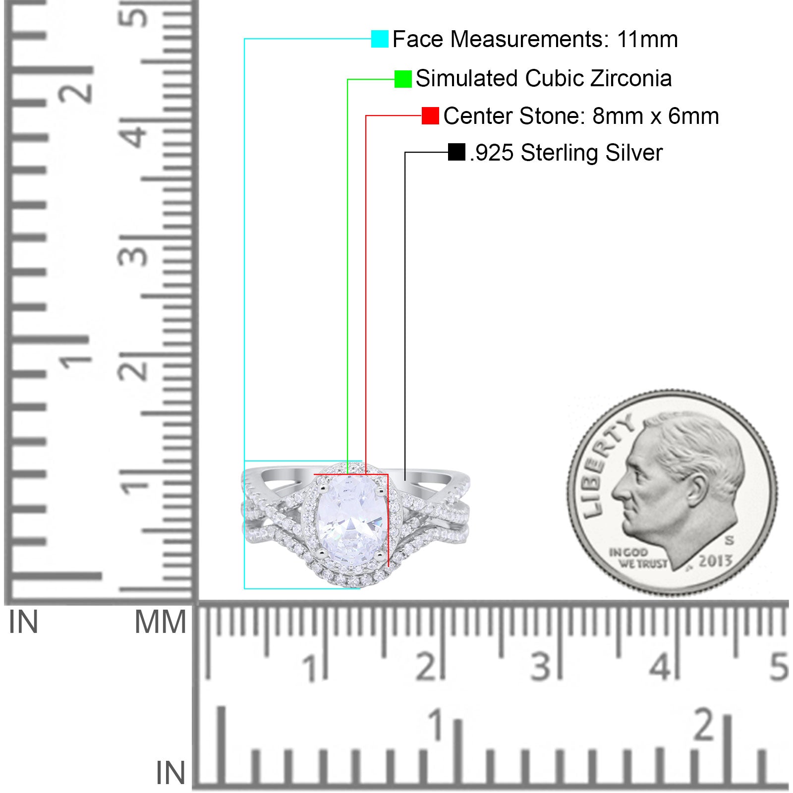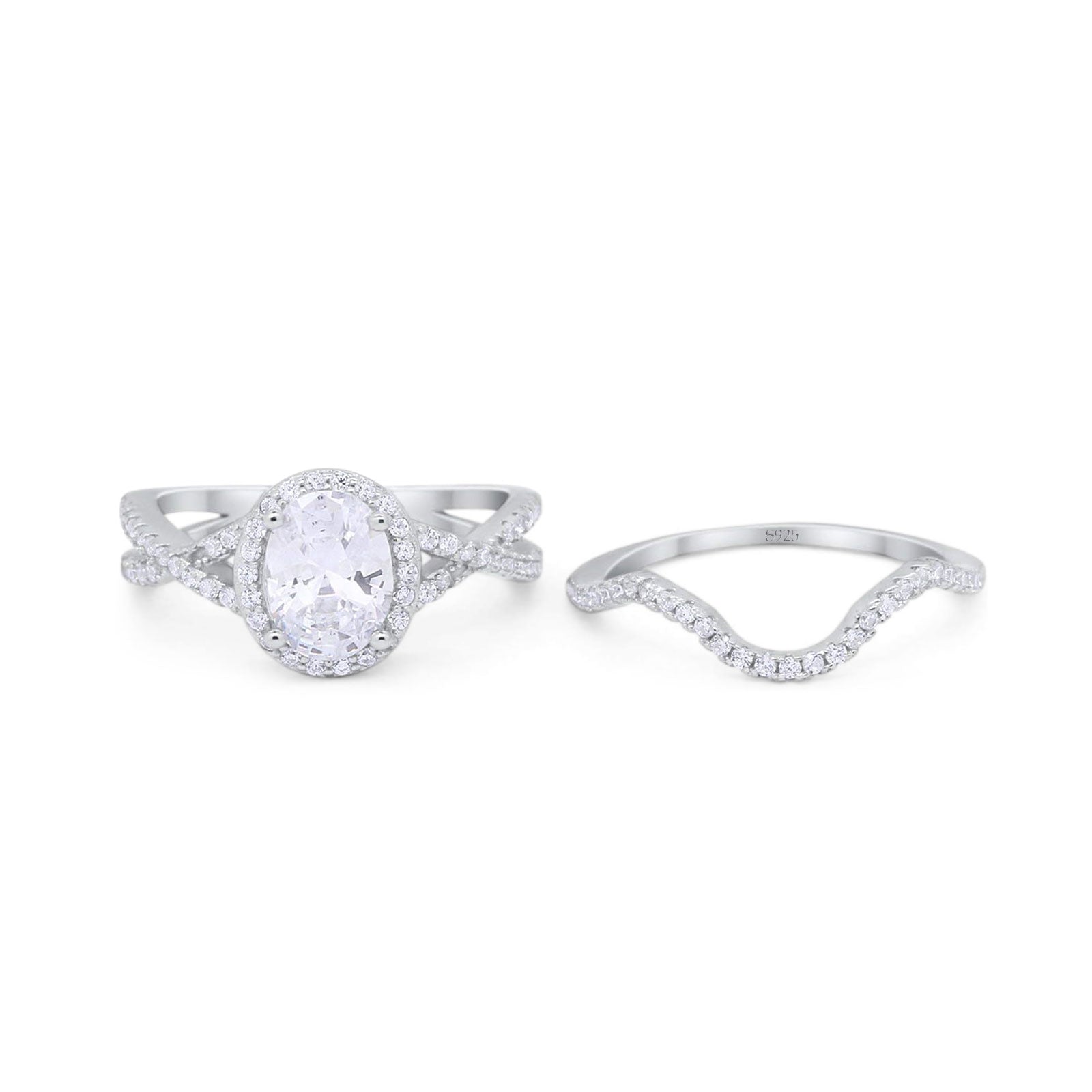 Two piece ring set - sparkling oval center cubic zirconia and split shank design, made of 925 genuine sterling silver, high gloss classic finish - an important, high volume wholesale item that appeals to multiple retailers, gift store owners and jewelry sellers. Provides customers who want to obtain an affordable luxury option with the ability to do so.
