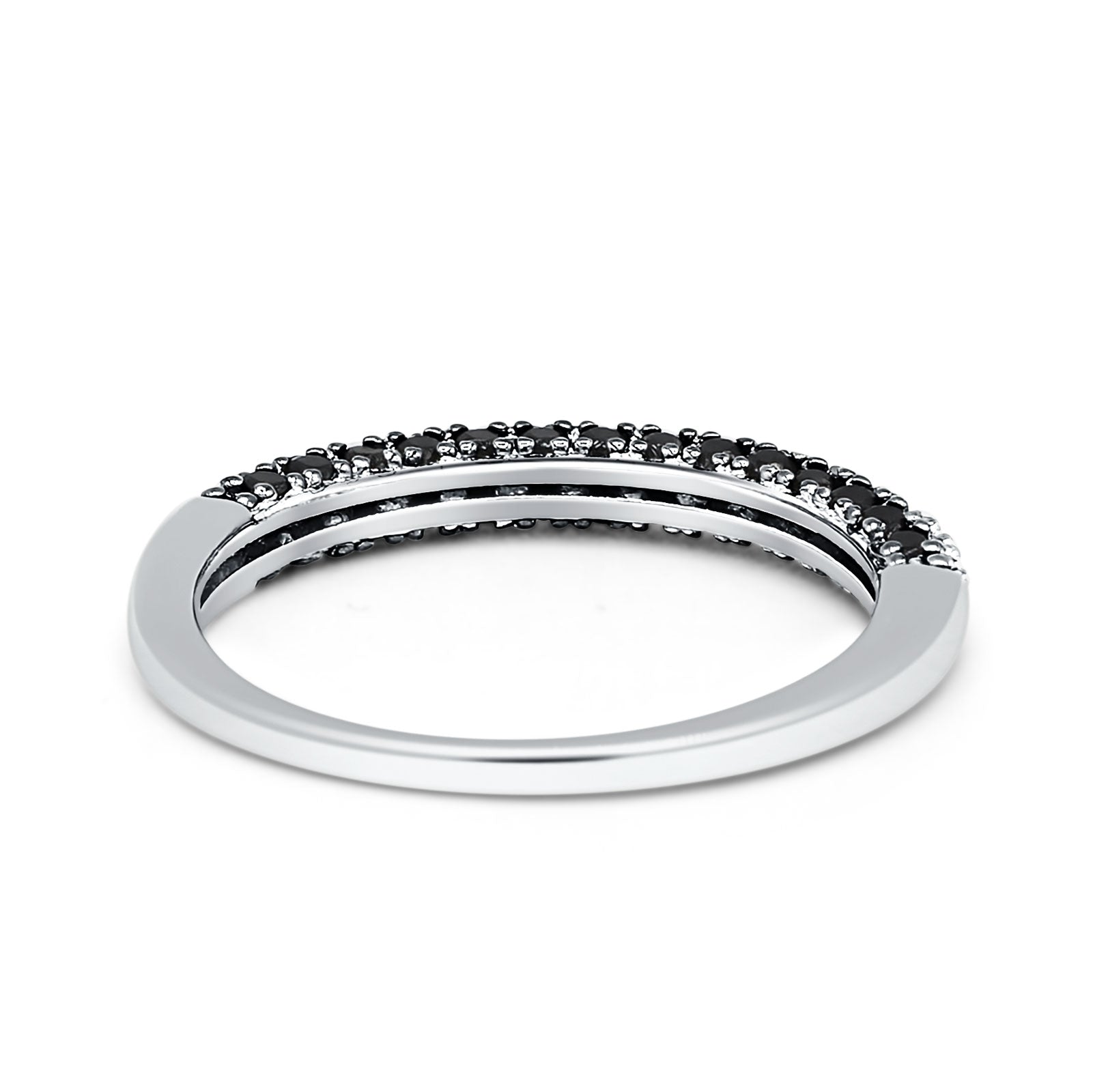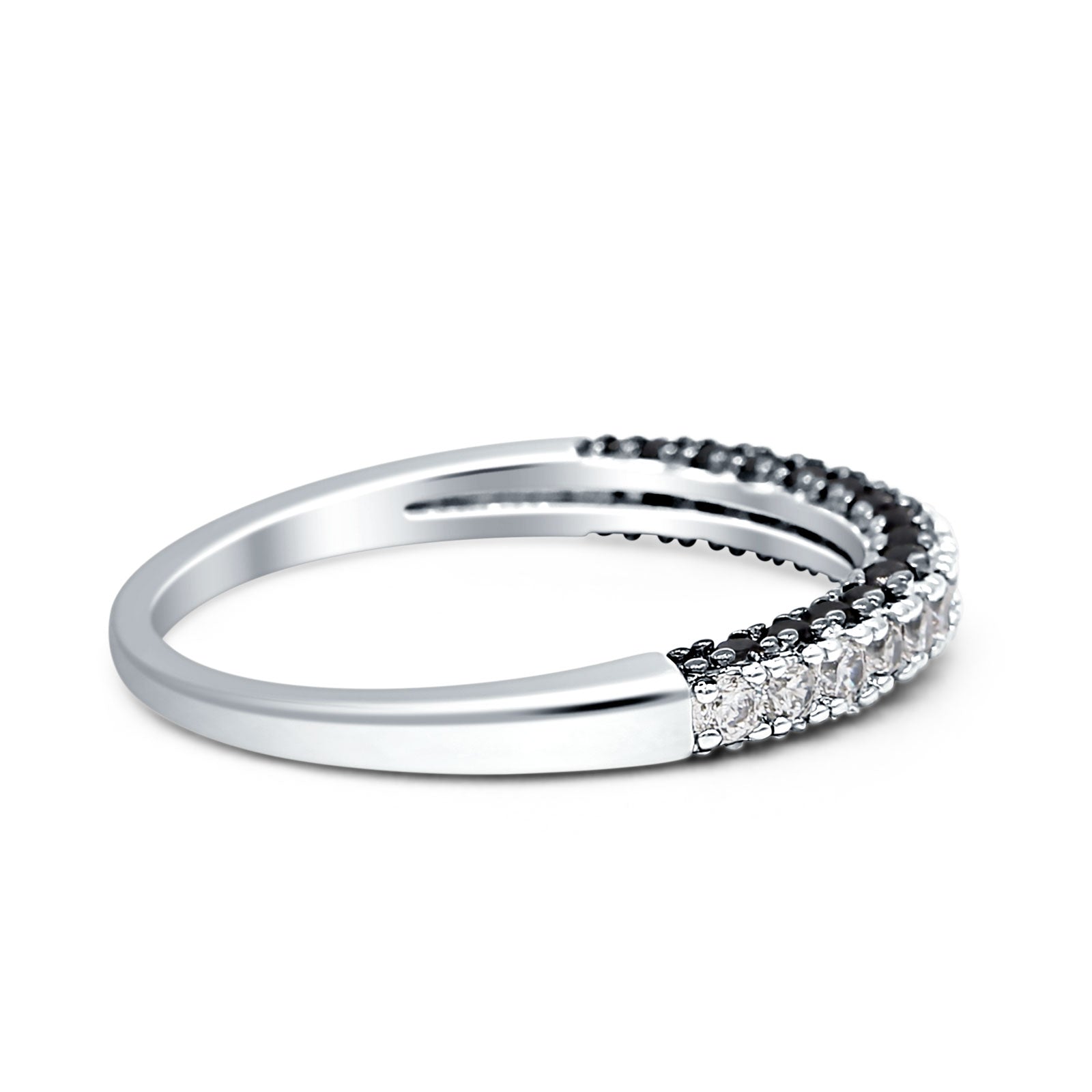 Cut from sterling silver, the 925 minimalist 2.5 mm two tone half eternity band has striking black cubic zirconia, giving it a sleek but sophisticated vintage appearance. This elegant piece is versatile enough to use as a wedding band, stacking ring or simply a beautiful everyday fashion statement for her and is sure to make the perfect gift.